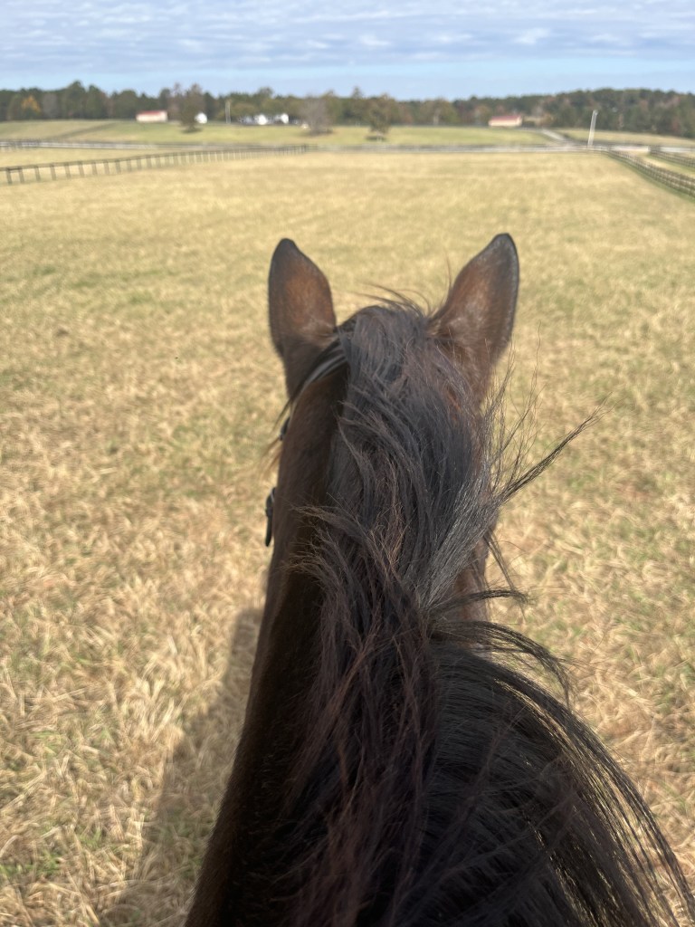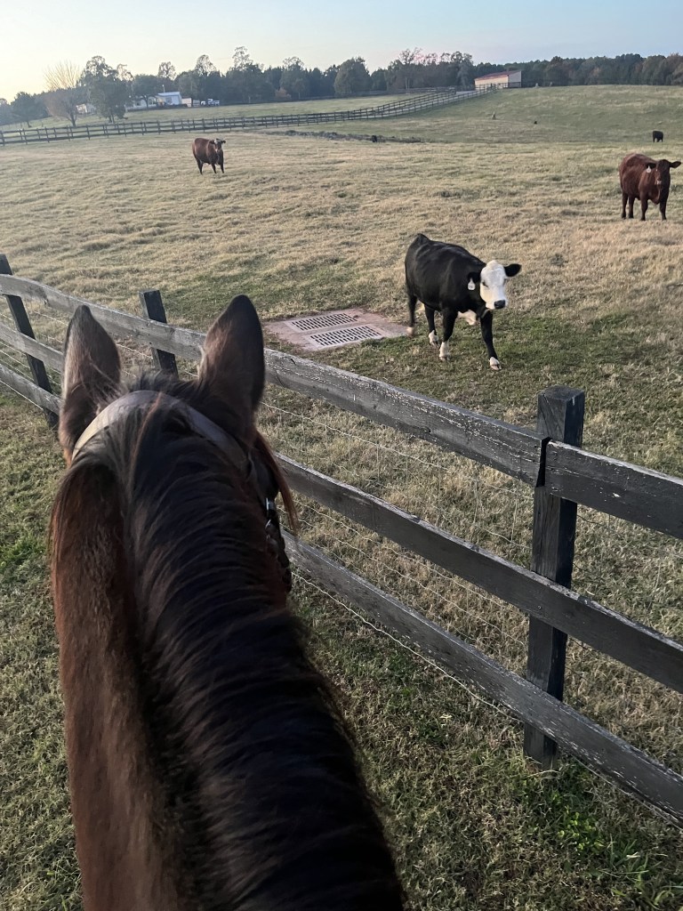 The farm is also home to some cows, which adds a fun dynamic to our rides. The property owner, a hobby western rider, has occasionally hosted roping events, but hasn’t in a long time. I haven’t met him yet, but it would be exciting to connect with others who enjoys such a different equestrian discipline. While I’m at work, Becca often takes Hanz on long hacks, giving him plenty of time to stretch his legs and enjoy the scenery. She’ll even send me pictures during the day, and I can’t help but smile knowing he’s out there, relaxed and happy.